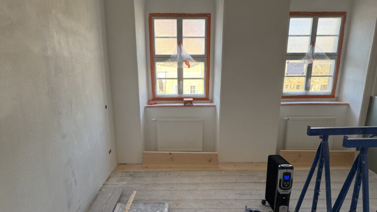 Doch im Innenbereich gibt es immer weitere Entwicklungen. Hier sehen wir, wie Daniel Wilhelm die Wände verputzt, der alte Charme des historischen Fachwerks wird selbstverständlich